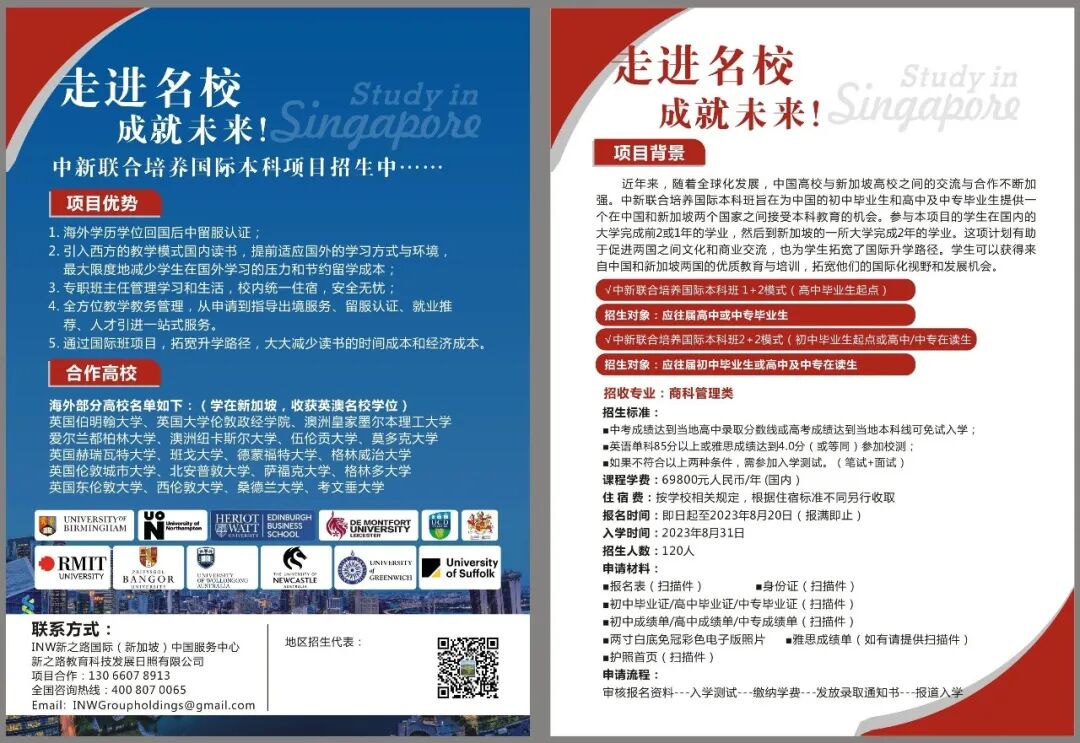 海外部分高校名单如下:(学在新加坡,收获多国名校学位) 英国伯明翰大学、英国大学伦敦政经学院、澳洲皇家墨尔本理工大学 爱尔兰都柏林大学、澳洲纽卡斯尔大学、伍伦贡大学、莫多克大学 英国赫瑞瓦特大学、班戈大学、德蒙福特大学、格林威治大学 英国伦敦城市大学、北安普敦大学、萨福克大学、格林多大学 英国东伦敦大学、西伦敦大学、桑德兰大学、考文垂大学 中新联合培养国际本科班 1+2模式(高中毕业生起点) 招生对象:应往届高中或中专毕业生 中新联合培养国际本科班2+2模式(初中毕业生起点或高中/中专在读生) 招生对象:应往届初中毕业证或者高中在读生 招收专业:商科管理类 招生标准: