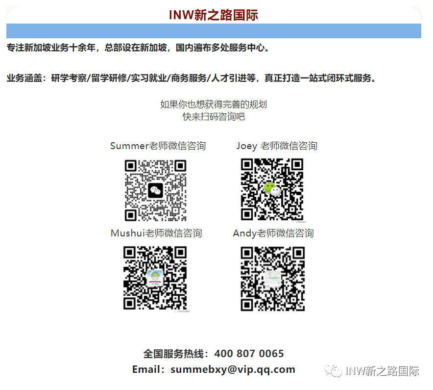报名时间:即日起至2023年8月20日(报满即止) 入学时间:2023年8月31日 招生人数:120人 申请材料: 报名表(扫描件) 身份证(扫描件) 初中毕业证/高中毕业证/中专毕业证(扫描件) 初中成绩单/高中成绩单/中专成绩单(扫描件) 两寸白底免冠彩色电子版照片 雅思成绩单(如有请提供扫描件) 护照首页(扫描件) 申请流程: 审核报名资料---入学测试---缴纳学费---发放录取通知书---报道入学 联系方式: INW新之路国际(新加坡)中国服务中心 新之路教育科技发展日照有限公司 项目合作:132 0633 6557 全国咨询热线:400 807 0065 联系人:Summer 卜老师 Email:INWGroupholdings@gmail.com